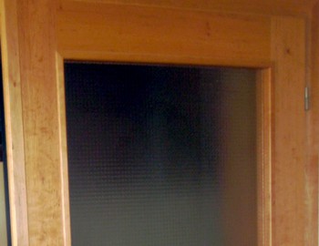 Obložkové vnitřní dveře 4 mají výrazně prosklenou plochu s matným průhledem, což prosvětluje tmavý prostor za nimi. Jejich světlá barva ladí se světlým vzorem podlahy. Mají pevný rám.