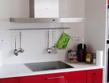 Prakticky a moderně řešená kuchyňská linka na míru v červeno bílých barvách s integrovaným jídelním koutem. Uprostřed linky dominuje dřez a varná deska. Malý ostrůvek prodlužuje jídelní stůl.
