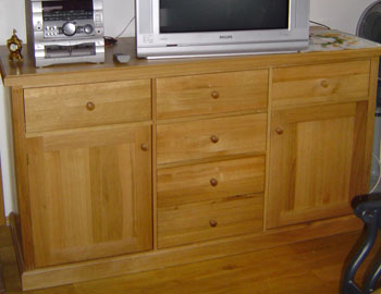 Nízká skříňka se šesti šuplaty a dvěma dvířky ve světlé příroní barvě poskytuje plochu pro nedílné předměty mnoha interiérů (TV, Hifi věž, rádio, budík, květiny, knihy).
