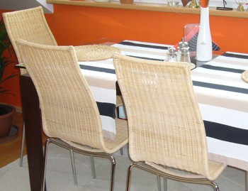 Náročnou kombinaci několika materiálů tohoto stolu se židlemi 2 bylo poměrně obtížné zkombinovat. Dřevěný masivní rám stolu se skleněnou deskou, proutěné židličky s kovovým rámem a dvoudílný ubrus s výraznými pruhy doplněný kulatým prostíráním, květinou ve štíhlé váze velmi dobře ladí s masivním osvětlením velikého okna v podkrovní místnosti.
